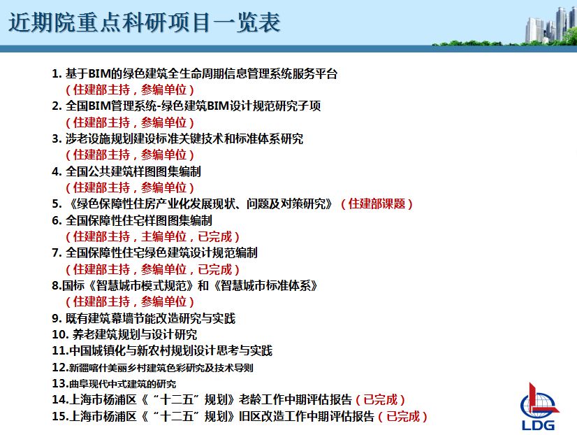 As a high-tech enterprise in Shanghai, we own 28 software copyrights; LDG participated in the compilation and publishing of national code of “Green affordable housing Technical Guidelines (trial)” authorized by National Department of housing construction, and we’ve also took part in the compilation works of National codes as follows: “Services platform of BIM-based green building life cycle information management system”, “ The National BIM Management System - Green Building BIM Design standard research subkey”, “Research of key technologies and standards involved in the old-age care facilities planning and construction standards”, “National Public buildings sample atlas”, “Green building design codes of National Indemnificatory housing” and “National Indemnificatory housing sample atlas”, “National smart city planning standard”, and “National smart city construction standard system research”.