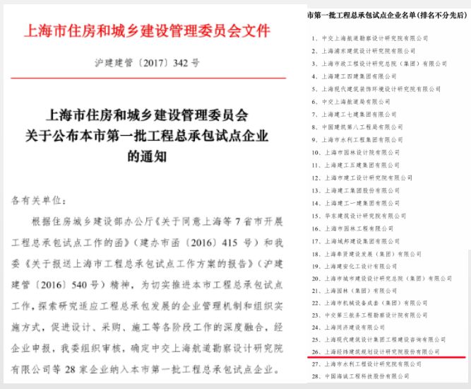 上海经纬被纳入“上海市第一批工程总承包试点企业”;
