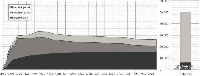 据官方数据统计,3月11日截止至7月23日,死亡人数共15562人,失踪人数共5306人,受伤人数共5690人;共114000座房屋发生倒塌,120186座房屋处于基本倒塌状态。对比1995年发生的阪神(Kobe)大地震(死亡人数为6434人,受伤人数为43792人,倒塌房屋共186175座),死亡人数超过了当年的1.5倍,但倒塌房屋的数量仅为当时的61.2%。
